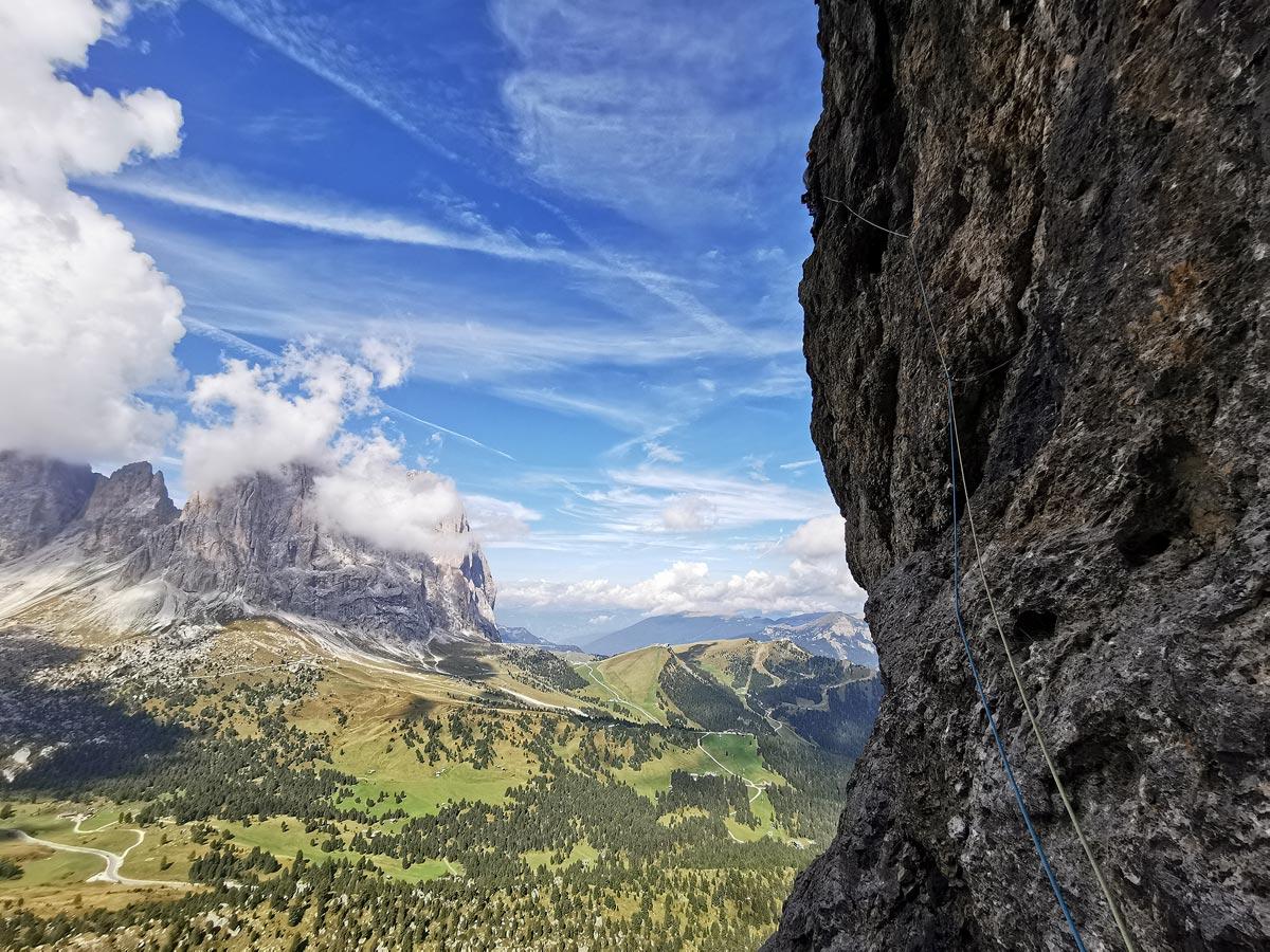 Den Rest der Gruppe zieht es zum Pordoijoch. Ziel ist der Dolomiten-Klassiker Mariakante an der Pordoispitze. Die Route, größtenteils im 4. Schwierigkeitsgrad, wird gut begangen und wurde über die letzten Jahrzehnte ordentlich glattpoliert. Alle Seilschaften erreichen den Gipfel neben der Bergstation der Seilbahn. Runter geht’s im Laufschritt bzw. mit der Seilbahn.