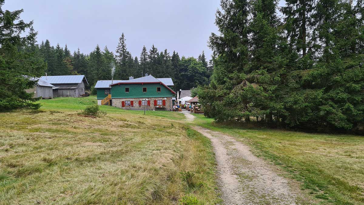 Unsere Tagestour startet dort gegen 8:40 Uhr. An der Ostseite des Schneeberges wandern wir südwärts im leichten auf und ab vorbei am Zinnschütz-Weiher bis zum südlichsten Punkt an der alten Silberhausstraße. Jetzt geht es steil bergauf bis zur Platte in 884m Seehöhe, wo wir eine kurze Rast machen. Weiter folgen wir dem Fränkischen Höhenweg bis wir nach ca. 10 km, der halben Tagestour, das „Seehaus“ unser Mittagsziel erreicht haben. Dort sind wir angemeldet und können nach Karte essen.