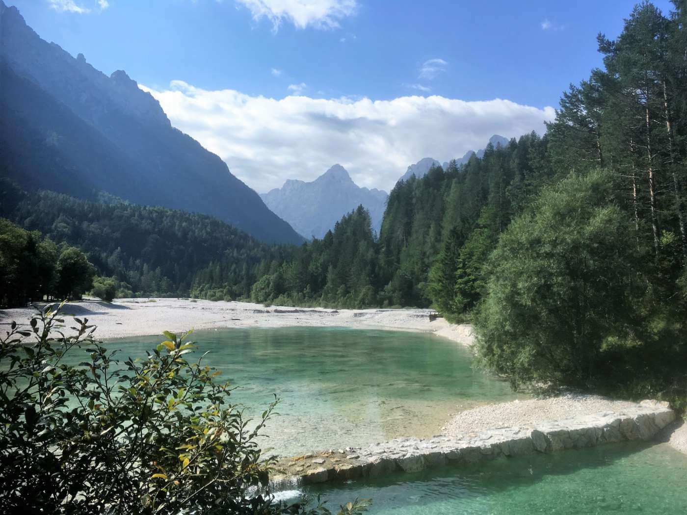 Kleiner Gang und durch! Der Vrsic-Pass (1611mH), im ersten Weltkrieg von russischen Kriegsgefangenen angelegt, erweist sich für alle als fahrbar. Die lange Abfahrt unterbrechen wir für einen kleinen Abstecher zur Quelle der Soca (ital. Isonzo), dieses beeindruckenden, schnell anschwellenden türkisblauen Bergflusses, dem wir eine Weile folgen werden und der von Outdooraktivisten aller Couleur, v.a. aber von Kajakfahrern und Raftern aufgesucht wird. Entlang der Soca rollen die Räder bis Bovec, einem Zentrum für Outdoor-Tourismus. Da hier die Infrastruktur offensichtlich mit dem touristischem Ansturm nicht Schritt gehalten hat, dauert es eine Weile, bis wir unsere leeren Bäuche mit Cevapcici-Burger stillen können.